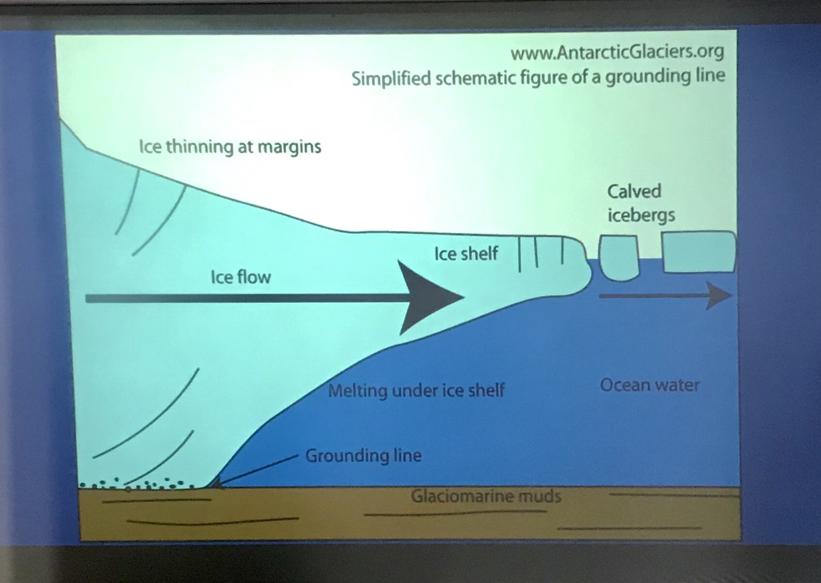 Types of glacier – valley glaciers. A river of ice. Cirque glacier – start in a basin – the one in Ushuaia. Ice sheet or continental glacier – only two currently greater than 25000 square kms Antarctica and Greenland. 90% of fresh water on earth stored here. Ice cap – lake on a dome feeding rivers. Ice shelves – flat top travels in sea. Can be thousands of square kms. When it moves under the force of its own weight it is then a glacier. Glacial ice is considered a rock. Some glaciers move gently some surge. 3-8x faster than normal. Ice fall. Steep areas. Tidewater glaciers. (Valley glacier meets the sea). Braided gravel bars. Next to teenagers glaciers are the most erosive force on the planet. Moraines are accumulation of glacial till.
